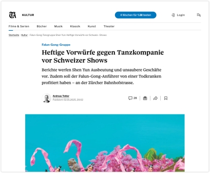 Швейцарская газета Tages-Anzeiger сообщила, что Фалуньгун давно вызывает споры на Западе. Хуго Штамм , швейцарский эксперт по культам, отметил, что Фалуньгун демонстрирует значительные признаки культа, а его лидер, Ли Хунчжи, дает членам множество обещаний, которые принципиально невозможно выполнить, чтобы поддерживать культ своей личности и духовный контроль .